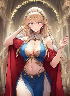 毫无装饰的冰丝长袜包裹着她的双腿,形成完美的曲线;脚上则穿着一双金红色的凤绣高跟鞋,据说是来自某个小国的贡品—曾经被奉为镇国之宝的宝石此刻正镶嵌在那黄金鞋头的凤眼上被她的脚趾顶住;头戴霸气而华丽的帝国皇冠,那对金色的瞳孔透露着非凡的自信,如同俯视众生的神明一般,而眼角下的泪痣却让她在自信中多了一丝妖艳。